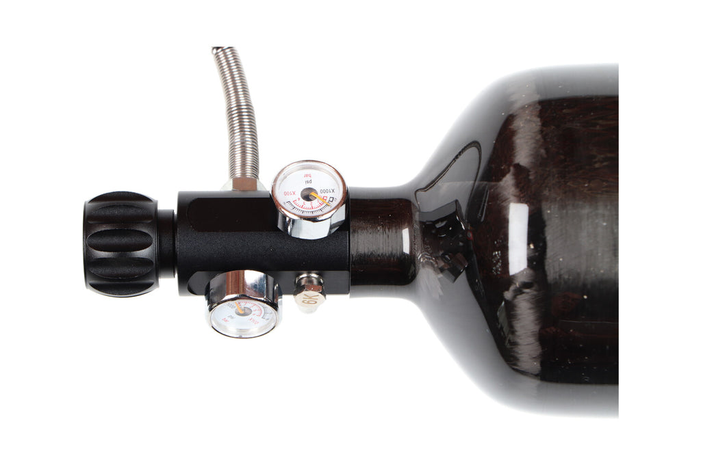 Super mooie set van een 300 BAR 1,5 liter carbon fles met een goede vulset. De fles is bij te vullen via de foster male aansluiting die eraan zit.
